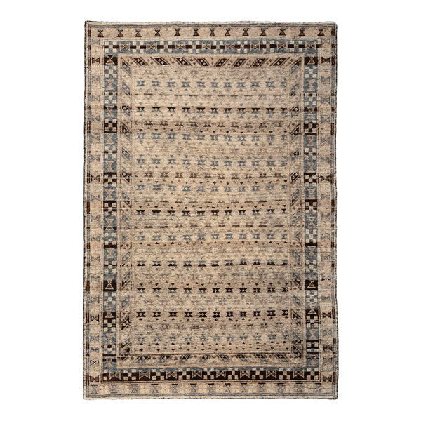 This Grey Traditional Wool Rug measures 6' x 9', offering a blend of traditional design and natural materials. Crafted from durable wool, this area rug originates from India, providing an authentic aesthetic suitable for various home decors. The rug features a muted grey and beige base, providing a versatile foundation for its pattern. Its central field is detailed with rows of small, repeating geometric motifs, including stylized crosses and triangles, rendered in subtle shades of light blue, grey, and dark...