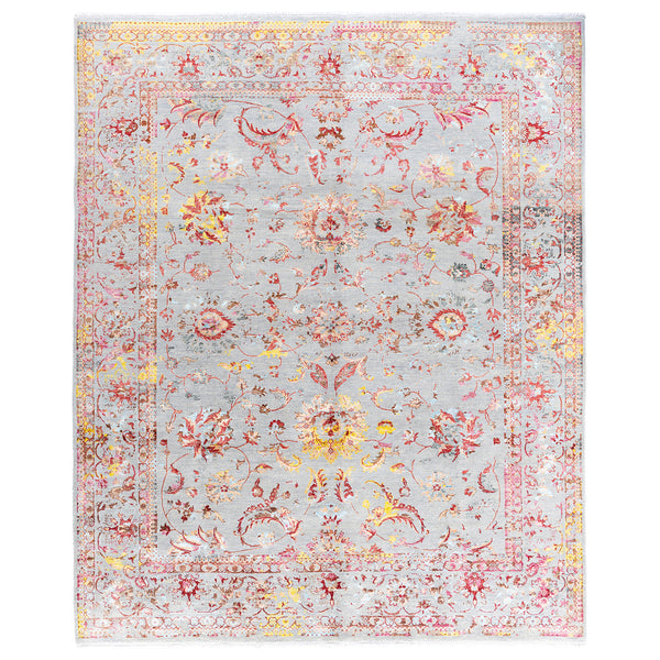 This Pink Traditional Wool Silk Blend Rug - 8'2" x 10'1" showcases a faded gray-blue background adorned with intricate floral and botanical designs in shades of pink, red, yellow, and green. Hand-knotted in India from 70% wool and 30% silk, this high-quality rug exudes traditional sophistication with its vintage appearance and precise craftsmanship. Add a touch of elegance to your space with this exquisite piece.