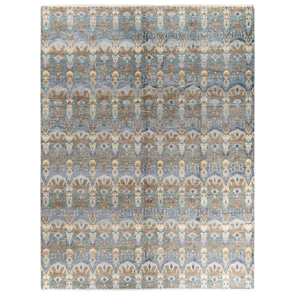 This Grey Traditional Wool Silk Blend rug from India measures 9'1" x 12'. Hand Knotted with 80% Wool, 20% Silk, this exquisite piece features a complex design with teardrop-shaped motifs, floral and geometric patterns in subdued blues, beiges, browns, and hints of ivory. The high-quality craftsmanship and intricate details make this rug a timeless and elegant addition to any space.
