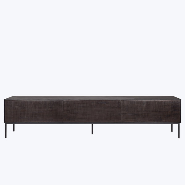 The Grooves Low TV Cupboard by Ethnicraft is a solid teak masterpiece of craftsmanship, finished in a sleek varnish. With dimensions of 95.5" L x 21" H x 18" D and weighing 131 lbs, this striking piece combines both form and function. Hand-carved grooves create a unique texture on every surface, ensuring that no two cupboards are alike. These small imperfections add a layer of depth and authenticity, making each piece truly one-of-a-kind. The cupboardās deep, dark-tinted teak extends seamlessly...