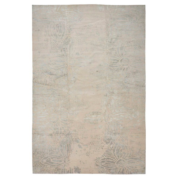 A luminous floral design shines through the soft tones of this wool and silk rug.