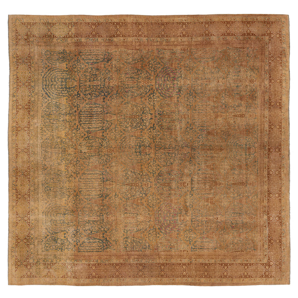 Commanding attention with its massive scale, this 20'5" x 21'1" Beige Vintage Tabriz Wool Rug is not just a piece underfoot—it's a statement. Imagine it sprawling across expansive living spaces or anchoring a grand dining area with a gentle authority that only such a vast, storied textile can wield. Hand-knotted in Iran, the rug hails from a land where rug-making is as rich as its history, and every piece is a testament to time and technique. The rug's gently aged...