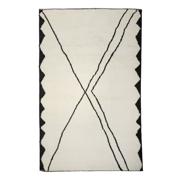 This Cream Moroccan Wool Rug - 6' x 9' features a modern geometric design with abstract black lines on a white background. Hand-knotted in India, this high-quality wool Moroccan rug exudes elegance and sophistication. Perfect for adding a touch of luxury to any room.
