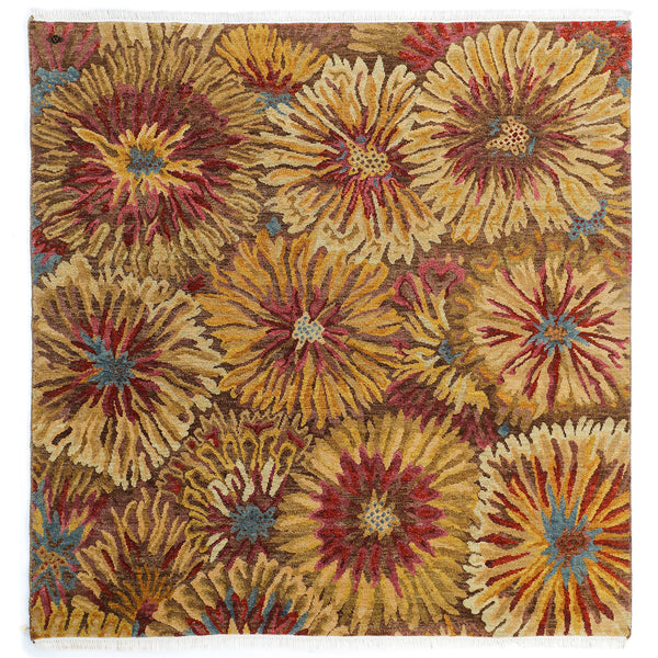 This brown contemporary wool rug measures 5 feet wide by 5 feet 3 inches long, offering a versatile size for various interior spaces. Classified as a transitional rug, its design bridges modern and traditional aesthetics. The rug is hand-knotted from wool, ensuring durability and a soft texture. The design features a repeating pattern of large, stylized flowers. These floral elements display a mix of warm tones, including golden yellows, deep amber, and rust, complemented by subtle accents of muted blue....