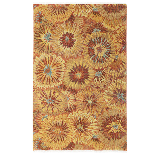 This 5'1" W x 7'11" L brown contemporary wool rug offers a blend of modern design and traditional hand-knotted craftsmanship. As a transitional area rug, it provides versatility in styling, suitable for various home decors from contemporary to more traditional settings. Crafted in India from durable wool, this rug features a distinct pattern of stylized floral motifs. The color palette primarily showcases warm brown, gold, and amber tones, with accents of reddish-brown and subtle light blue integrated into the flower...