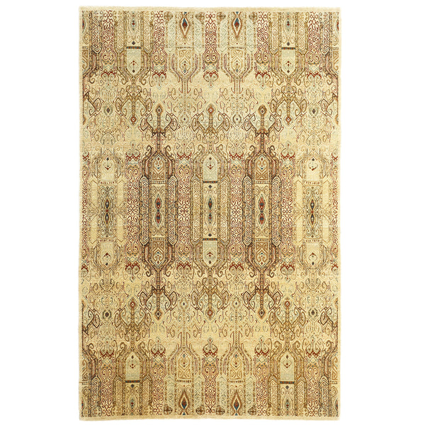This One-of-a-Kind, Hand-Knotted Area Rug - 5'1" x 8' features a distressed geometric pattern in neutral tones of beige. Hand-crafted rugs are created over many months using techniques that have been passed down from generation to generation. This level of detailed craftsmanship means this one-of-a-kind rug is made to last. Hand-knotted and colored using plant-based dyes, this rug features rich, saturated colors that are eco-friendly and free from harsh chemicals and synthetic compounds.