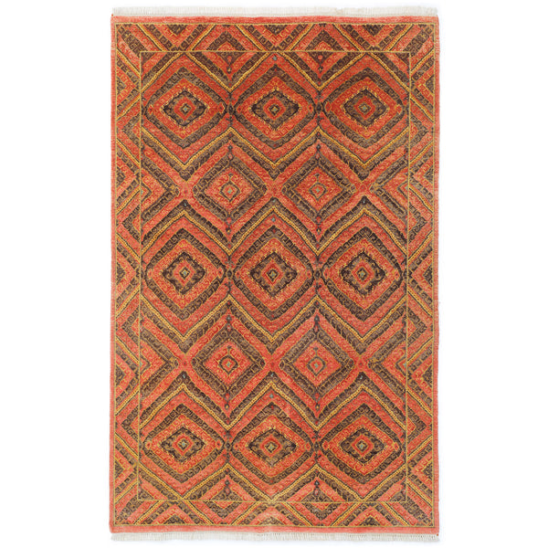 This Red Transitional Wool Rug measures 5'1" wide by 8'1" long, offering a blend of traditional craftsmanship and contemporary design. It features a hand-knotted construction, originating from India, which ensures durability and a unique finish. The rug showcases a geometric diamond pattern across its field. This design primarily uses a reddish-orange base, accented with precise brown and golden yellow lines that form nested diamond shapes. A defined border frames the central pattern, giving the rug a structured appearance. This pattern...