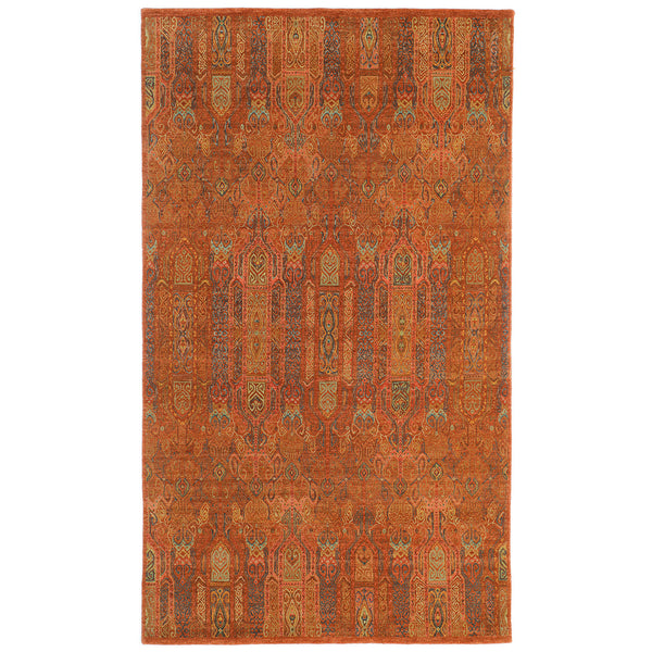 This One-of-a-Kind, Hand-Knotted Area Rug - 5'1" x 8'6" features a distressed geometric design in bold colors of orange, green, and blue. Hand-crafted rugs are created over many months using techniques that have been passed down from generation to generation. This level of detailed craftsmanship means this one-of-a-kind rug is made to last. Hand-knotted and colored using plant-based dyes, this rug features rich, saturated colors that are eco-friendly and free from harsh chemicals and synthetic compounds.