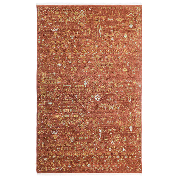This One-of-a-Kind, Hand-Knotted Area Rug - 5'2" x 8'2" is an intricate geometric masterpiece in bright tones of orange, yellow, red, and blue. Hand-crafted rugs are created over many months using techniques that have been passed down from generation to generation. This level of detailed craftsmanship means this one-of-a-kind rug is made to last. Hand-knotted and colored using plant-based dyes, this rug features rich, saturated colors that are eco-friendly and free from harsh chemicals and synthetic compounds.