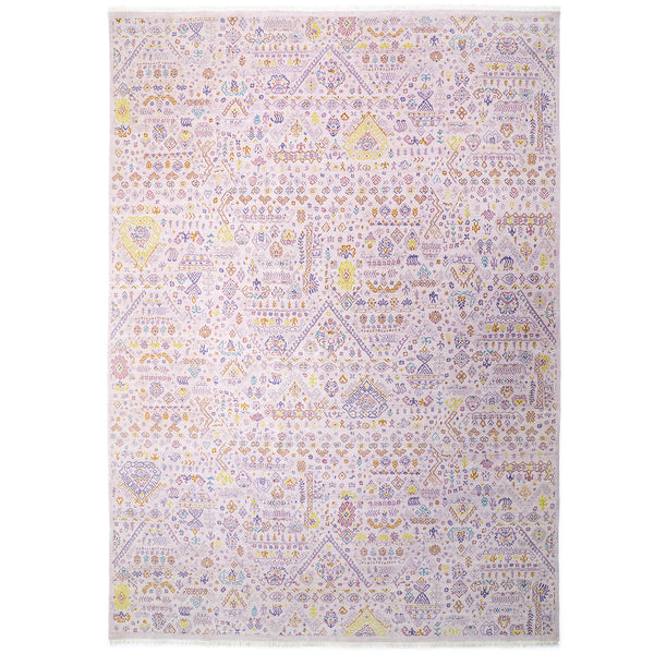 This Purple Transitional Wool Rug - 9'1" x 12'3" features a floral-inspired geometric pattern in eye-catching shades of purple, yellow, and brown. Hand-crafted rugs are created over many months using techniques that have been passed down from generation to generation. This level of detailed craftsmanship means this one-of-a-kind rug is made to last. Hand-knotted and colored using plant-based dyes, this rug features rich, saturated colors that are eco-friendly and free from harsh chemicals and synthetic compounds.