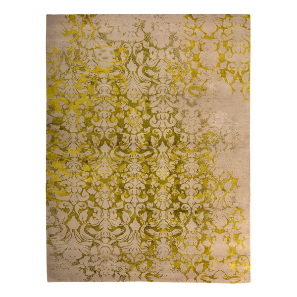 The Brown and Green Contemporary Silk Wool Blend Rug - 8' x 10'3 features a stunning ornate pattern with intricate floral motifs in shades of yellow and green on a neutral background. Hand-knotted in Nepal, this high-quality rug exudes vintage elegance with its silk and wool blend material. Perfect for adding warmth and sophistication to any room.