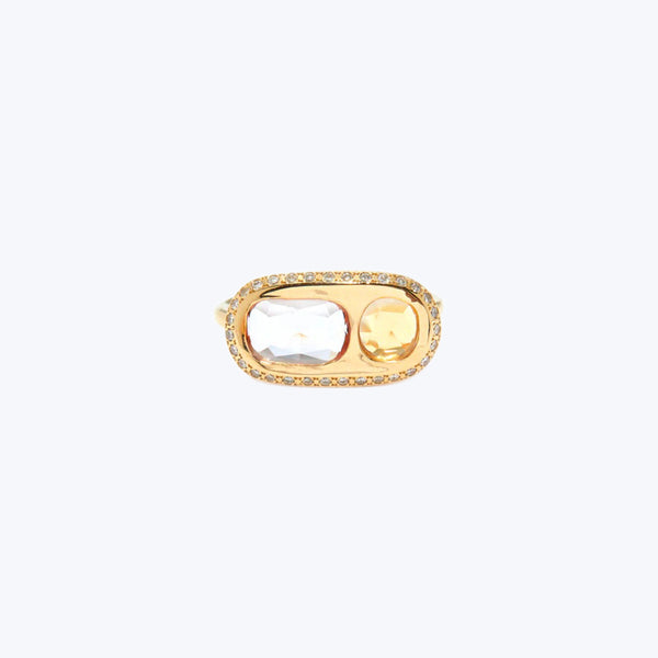 Featuring a pillowy antique cushion cut Pink Topaz alongside a rose cut oval Peach Sapphire set in 14k Yellow Gold. A halo of brilliant cut white Diamonds adds extra sparkle and brightness!