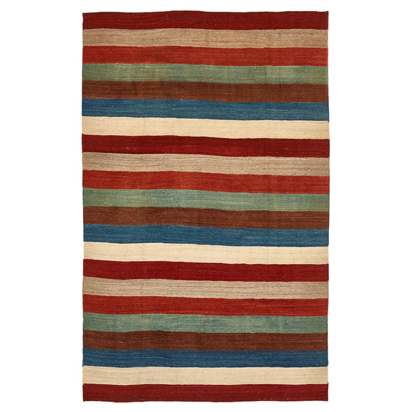 A hand-woven multicolored flatweave wool rug stands boldly at 7 feet 5 inches by 11 feet 6 inches, promising to transform expansive living spaces, dining rooms, or bedrooms. Crafted entirely from natural wool, this rug offers a soft yet resilient surface, perfectly suited for bustling households. Wool's natural tendency to resist stains and repel dirt makes it an ideal companion for daily life, effortlessly accommodating high-traffic areas. The flatweave design eliminates the pile, ensuring minimal shedding and simplifying maintenance. The...
