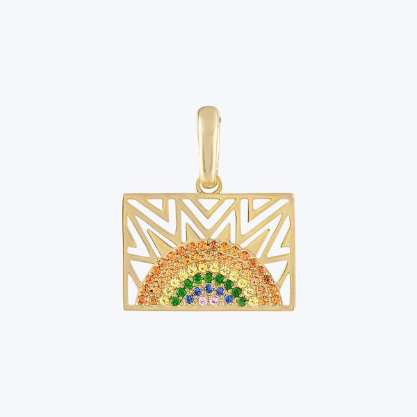 Add joyful color to your jewelry collection with Eden Presley's Here Comes The Sun Pendant. Crafted in 14K yellow gold, this beautiful pendant features a rainbow design of vibrant sapphires. Use the detachable bale to clip the pendant onto a necklace or drop earring. Handmade in the USA.