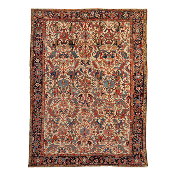 This is a vintage hand-knotted Heriz rug, originating from Iran. Measuring 8'6" x 10'11", this area rug features a traditional Persian design rendered in durable wool. The rug displays a classic Heriz pattern, characterized by a dense, all-over field design. Stylized botanical and geometric motifs are arranged in a repeating pattern across a light cream or ivory background. Dominant red tones are present throughout the field, complemented by shades of blue, and accents of darker colors like navy or black....