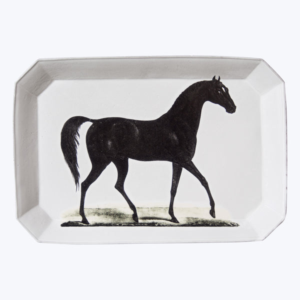 Designed in collaboration with Astier de Villatte, John Derian’s Horse Platter brings refinement to any setting. This elegant platter elevates both in design and shape—boasting a meticulously detailed motif and clean-cut angles. Handcrafted in black terracotta clay and finished in a white enamel glaze in Astier de Villatte’s ceramics studio in Paris.
