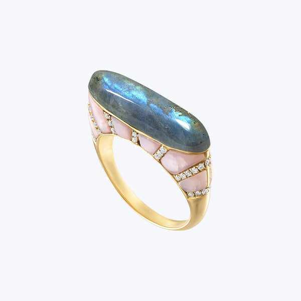Stunning stacked or on its own, Eden Presley's In Pieces Stack Ring brings elevated edge to your jewelry collection. This gorgeous ring is crafted in 14K gold and features a Chrysocolla stone, as well as pink opal and 0.31cts. diamond accents. Wear solo or style with the Presley Stack Ring. Handmade in the USA.