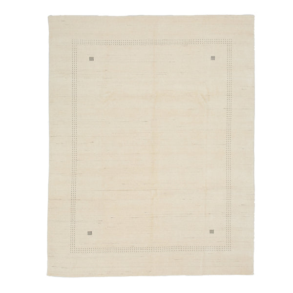 The White Solid Indo Gabbeh rug, 8'1" x 10'2" from India, is hand-knotted from high-quality wool. The simple yet elegant design features a border with punctured holes and corners with a matching pattern. The natural variations in the thread and weave add to the beauty and texture of this exquisite piece.