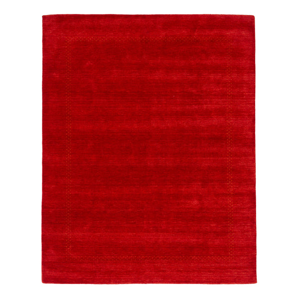 The Red Solid Indo Gabbeh Rug is a luxurious 8'1" x 9'10" hand-knotted wool piece from India. The deep, rich red color and fine hemmed edges give it a simple yet elegant look. The subtle shading suggests a textured weave, adding to its quality and charm. Perfect for adding a touch of sophistication to any space.