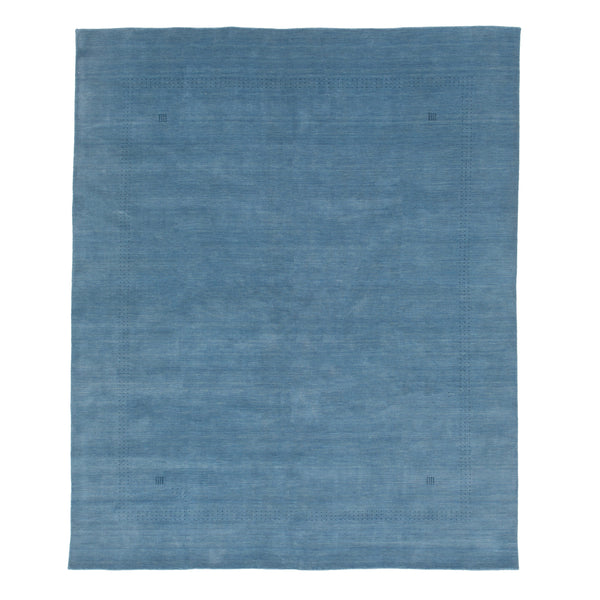 The Blue Solid Indo Gabbeh Rug - 8'4" x 10'2" is a hand-knotted masterpiece from India. Its smooth texture and subtle variations in shading give it a natural, high-quality feel. The blue color is enhanced by patterns of dots creating square and rectangular shapes, adding to its decorative appeal. Made of wool, this rug exudes elegance and craftsmanship.