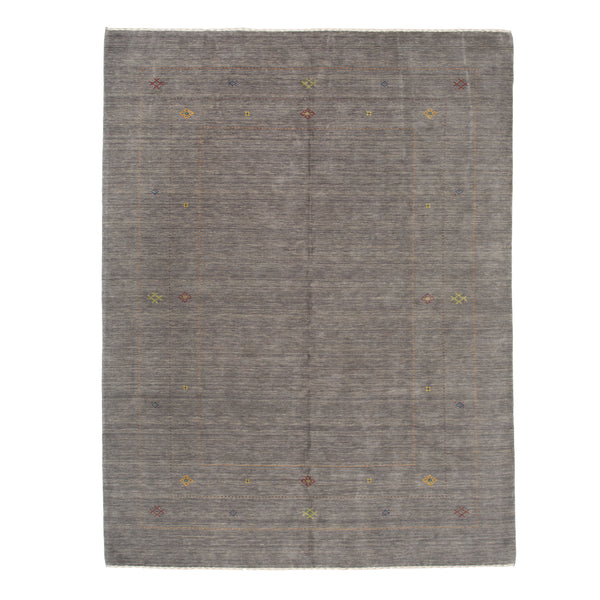This Indo Gabbeh rug features a solid grey field with subtle textural variations. Crafted from 100% wool, this hand-knotted piece measures 9'3" x 12'. The rug is constructed using traditional hand-knotting techniques in India, contributing to its durability and unique character. Its predominantly grey surface is interspersed with small, scattered geometric motifs in various colors, including hints of yellow, red, and blue. These modest design elements add visual texture and interest, complementing the solid background without overpowering it. Made from...