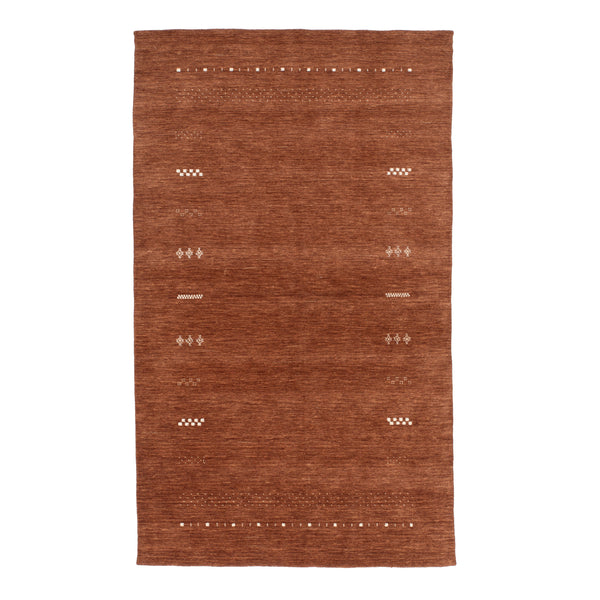 This Indo Gabbeh rug, measuring 5'2" by 8'5", features a hand-knotted construction from India. It presents a rich, earthy brown color, providing a warm foundation for various interior styles. Crafted entirely from wool, this rug combines natural material quality with a durable build. The design falls into the "Solids + Textures" category. While the primary field is a uniform brown, the rug incorporates subtle textural patterns. These details are formed by small, geometric motifs in lighter tones, including fine lines,...