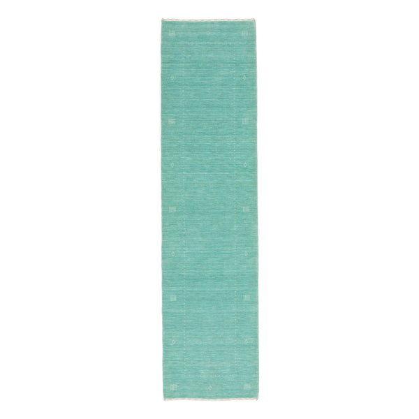 The Light Green Solid Indo Gabbeh Runner is a hand-knotted, wool rug from India. Its turquoise and light Green color palette is complemented by a subtle geometric design, adding texture and depth. This 2'7" x 10'1" runner exudes simplicity and modern style, perfect for adding a touch of elegance to any space.