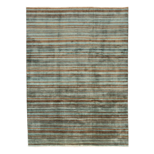 The Blue Contemporary Indo Savannah Rug combines modern design with traditional craftsmanship. This large area rug measures 8 feet 10 inches by 11 feet 10 inches, making it a suitable centerpiece for various room layouts. It is crafted from wool and features a hand-knotted construction, offering both durability and a comfortable feel underfoot. This contemporary rug showcases a distinctive striped pattern. The design incorporates a palette of blues and teals, complemented by earthy brown tones, creating visual interest. The varied...