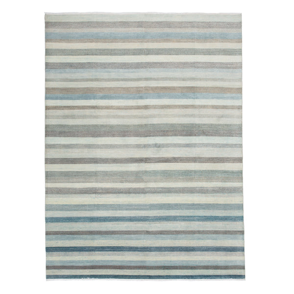 This Multicolored Contemporary Indo Savannah Rug offers a blend of modern design and traditional craftsmanship. Measuring 9'1" x 12'1", this large area rug is constructed from 100% wool using a hand-knotted technique, ensuring durability and a soft underfoot feel suitable for high-traffic areas. The contemporary style is defined by its clean lines and appealing color palette. The rug features a stripe pattern composed of various shades of blue, gray, and cream. These horizontal stripes vary in width, creating a dynamic...