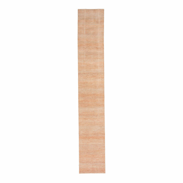 The Pink Solid Indo Savannah Runner is a beautifully crafted rug from India. Hand-knotted with wool, it showcases a textured pattern with alternating bands of tight and loose weaves in a muted beige and light brown color palette. Its clean edges and symmetrical design suggest quality craftsmanship. Perfect for narrow spaces like hallways, this elegant runner brings warmth and style to any home.