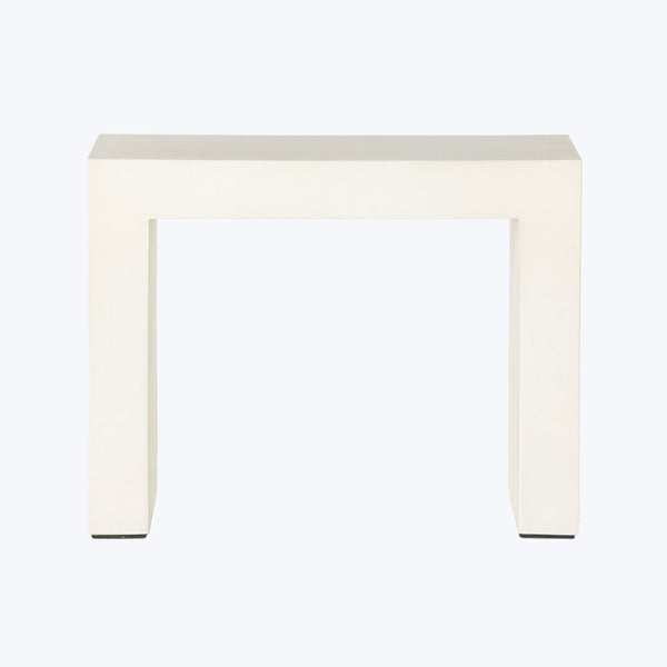Industrial materials in smoothly refined shapes. Smooth concrete forms a Parsons-style side table. This piece is designed in collaboration with Thomas Bina, whose partnership with the renowned Los Angeles furniture designer began in the early 2000s, producing several unique collections including reclaimed wood-driven case goods and Brazilian-inspired upholstery. Suitable for indoor or outdoor spaces. Cover or store indoors during inclement weather and when not in use.