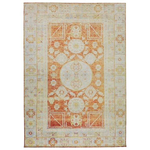 This large area rug is part of the Alchemy Rug Collection, offering a blend of traditional design and handcrafted quality. Measuring 8 feet 9 inches by 12 feet 5 inches, it is suitable for various substantial living spaces. The rug is hand-knotted in India from 100% silk, a material known for its soft texture and natural sheen. This traditional construction method ensures durability and intricate pattern detail. The design features an ivory and warm terracotta color palette. The central field...