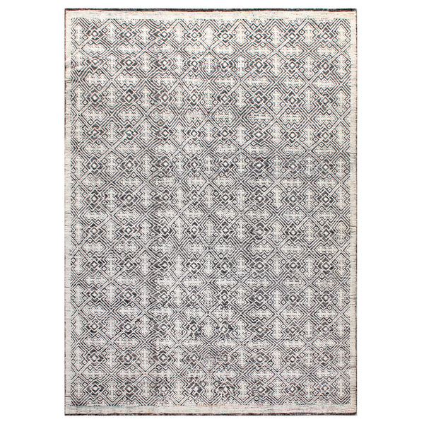 This Ivory Black Traditional Wool Rug is a 9'1" x 12' hand-knotted masterpiece from India. This traditional rug features a detailed geometric pattern in black and white, creating a textured and intricate design. Made from 100% wool, this high-end rug exudes quality and elegance in every inch.