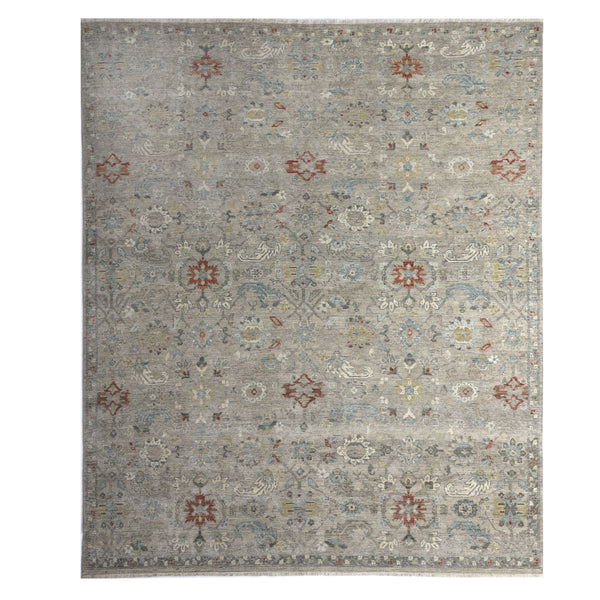 This Traditional Wool Rug measures 7'8" x 9'8", offering a blend of classic design and durable craftsmanship. Hand-knotted in India, this area rug is constructed from 100% wool. The rug features a primary ivory hue, which presents as a soft, muted grey-beige in its overall appearance. An intricate, all-over traditional pattern covers the surface. This design includes repeating floral and geometric motifs, accented with colors such as muted red, soft blue, and subtle gold. The detailed pattern provides visual interest...