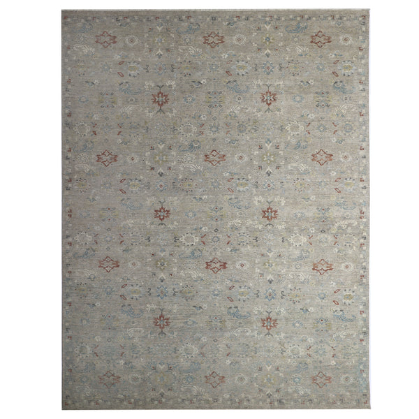 This traditional hand-knotted wool rug, crafted in India, provides a timeless foundation for various interior designs. Measuring 9 feet 9 inches by 13 feet 10 inches, this large area rug is designed to anchor spacious rooms. The rug features a soft, muted ivory base color, offering a versatile backdrop for its intricate pattern. Adorning the surface is a dispersed, all-over traditional design, characterized by an array of detailed motifs. These patterns incorporate subtle accents of muted red, soft blue, and...