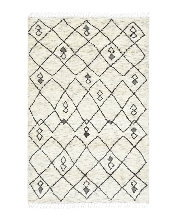 This Ivory Moroccan Wool Cotton Blend Rug - 9' x 12' features a timeless geometric pattern on a creamy white background. Hand-knotted in India, this rug is crafted from a luxurious wool-cotton blend. Its symmetrical design and high-quality materials make it a stunning addition to any space.