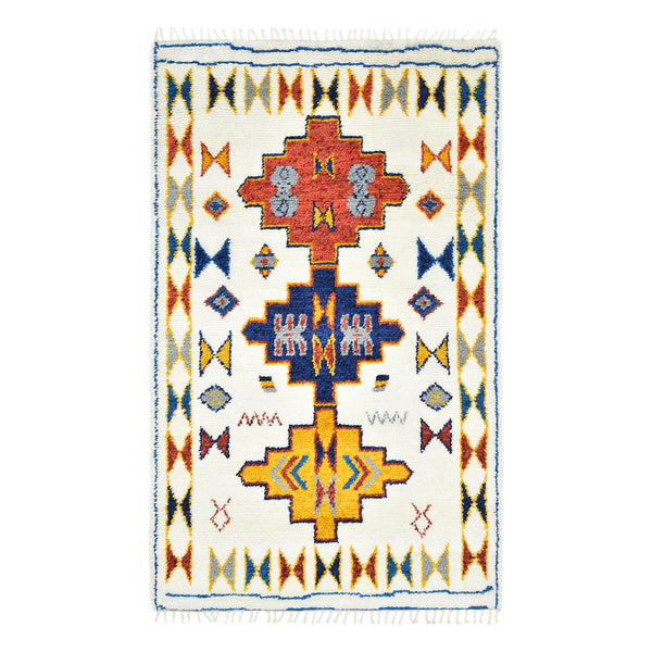 The Multicolored Moroccan Wool Cotton Blend Rug showcases a handwoven design with a striking geometric pattern in shades of orange, blue, and gray-black on a cream base. This high-quality rug from India is hand knotted out of 80% Wool, 20% Cotton, offering a luxurious texture and traditional aesthetic. The intricate tribal-inspired motif and short fringes add a cultural touch to any room's decor.