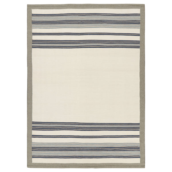 This Ivory Swedish Inspired Flatweave Wool Rug offers a minimalist design suitable for various home aesthetics. Measuring 9'10" x 13'10", this large rug is hand-woven from durable wool, providing a flatweave construction that is both practical and stylish. The rug features an ivory main field, providing a neutral base. Horizontal stripes adorn both ends of the rug, incorporating shades of navy blue, medium blue, and light blue. These stripes are arranged in clean lines, contributing to the rug's Scandinavian-inspired aesthetic....