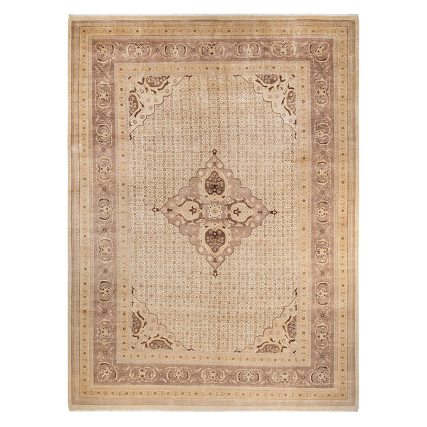 The Ivory Traditional Mogul Wool Rug offers a timeless design element for classic interiors. This hand-knotted rug measures 10'2" x 13'7" and is a product of Pakistani craftsmanship. Constructed from 100% natural wool, this rug utilizes traditional hand-knotting techniques, which contribute to its dense pile and overall durability. The natural properties of wool provide resilience against wear, warmth, and a soft texture underfoot, making it suitable for areas with regular foot traffic. The design is rooted in traditional Mogul aesthetics,...