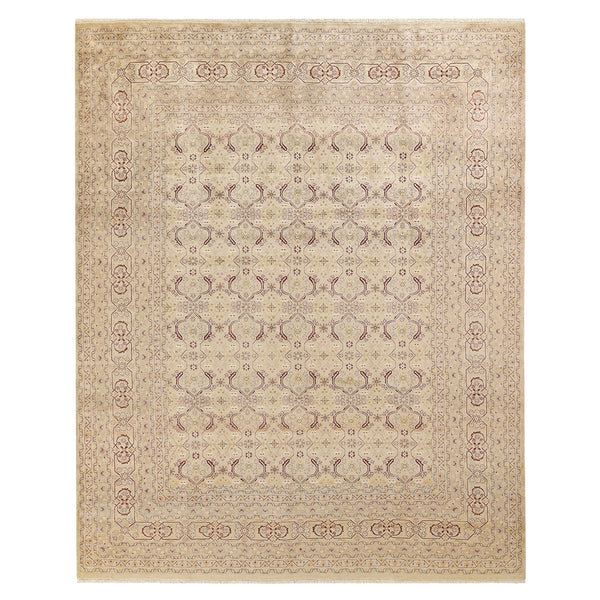 This Ivory Traditional Mogul Wool rug from Pakistan is a masterpiece in design. Featuring a symmetrical pattern in shades of beige, brown, and maroon, this hand-knotted rug exudes elegance. The intricate geometric and floral motifs on a wool base make it a luxurious addition to any room.