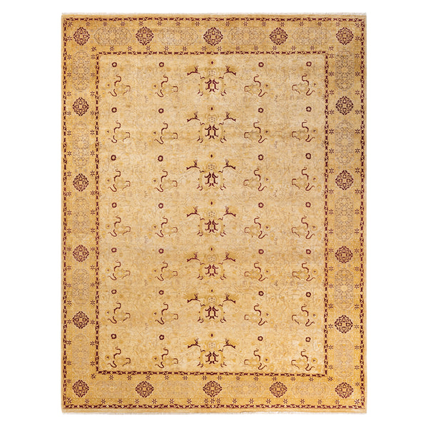 This Traditional Mogul Wool Rug measures 8'2" by 10'5", offering a substantial foundation for various interior spaces. Constructed from natural wool, this rug is hand-knotted in Pakistan, reflecting traditional craftsmanship. The rug features a beige primary color, providing a neutral base. Its field displays scattered, curvilinear motifs in contrasting reddish-brown and lighter gold tones. A distinct border frames the central design, incorporating repeating medallion-like patterns and geometric details in matching accent colors. This design aligns with the intricate aesthetics characteristic...