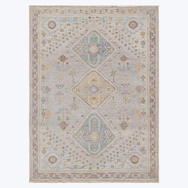 The Ivory Traditional Wool Rug - 4' 11" x 6' 8" showcases an intricate design in muted shades of beige, blue, and pastel colors. Hand-knotted in India, it features symmetrical patterns, floral motifs, and geometric symbols that exude a vintage charm. Crafted from wool, it offers luxurious texture and lasting durability.