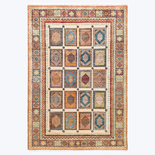This Multicolored Traditional Wool Rug - 5' 10" x 8' 3" originates in India. Hand-knotted from high-quality wool, it features intricate diamond-shaped motifs in earthy tones of terracotta, beige, blue, brown, and green. The symmetrical design is bordered with geometric patterns, showcasing its traditional craftsmanship. This rug is a harmonious piece that adds elegance to any space.