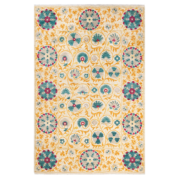 This Yellow Traditional Wool Rug - 6' 3 x 9' 2" is a masterpiece from India. Its detailed border features large circular patterns in shades of blueish-green, plus intricate floral and botanical motifs. Hand-knotted from high-quality wool, this rug offers texture and warmth to any space.