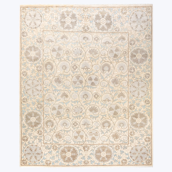 This Ivory Traditional Wool Rug - 8' 1" x 9' 9" is a masterpiece from India. Its detailed border features large circular patterns in muted shades of cream, beige, and light blue, plus intricate floral and botanical motifs. Hand-knotted from high-quality wool, this rug offers texture and warmth to any space.