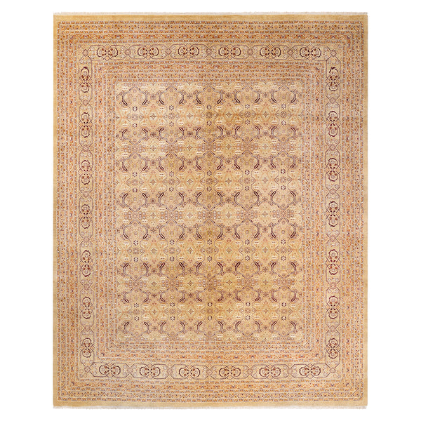 This Ivory Traditional Wool Rug measures 8 feet 2 inches by 10 feet 3 inches, suitable for various room sizes including living rooms, dining areas, or master bedrooms. It is a hand-knotted area rug crafted from natural wool, offering both durability and a soft texture underfoot. The rug features an ivory base color, which provides a neutral foundation for its detailed pattern. The design incorporates an all-over field pattern with repeating botanical and geometric motifs in shades of terracotta, rust,...
