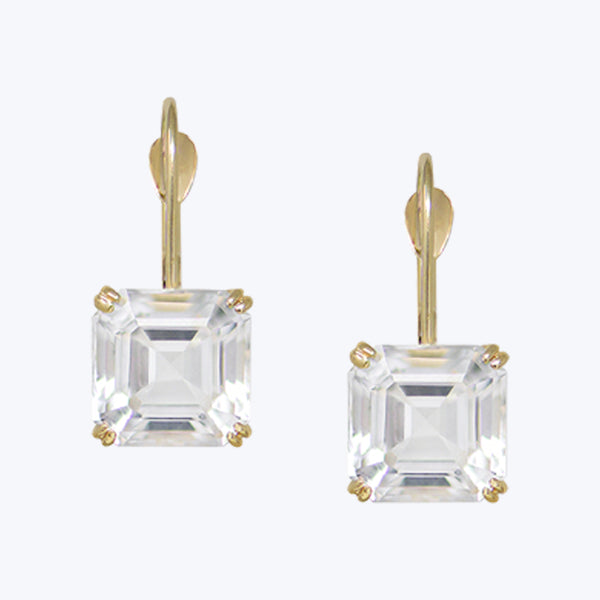 Dazzling asscher cut clear topaz gemstones are set in dainty prongs dangling from rich gold french clips.
