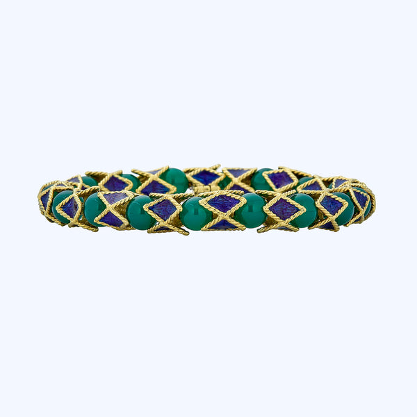 The Jade Enamel Snake Bracelet is a stunning piece of 1980s jewelry. Its vibrant green stones and trapezoid-shaped blue inlays create a visually striking pattern. Made of gold-tone metal with a twisted design, this bracelet adds a decorative touch to any outfit. Crafted with high-quality materials, it exudes elegance and charm.