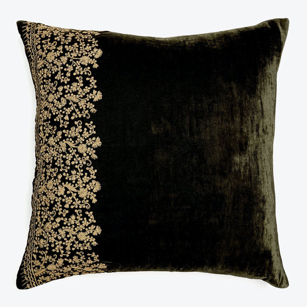 Silk velvet in a rich dark green is adorned with intricate flowers and vine motifs, embroidered by hand using dori thread with metallic input. Created exclusively for ABC, the Jamila pillow weaves together the most exacting needlework in the art of embroidery with haute couture elements, bringing an heirloom quality to its setting.