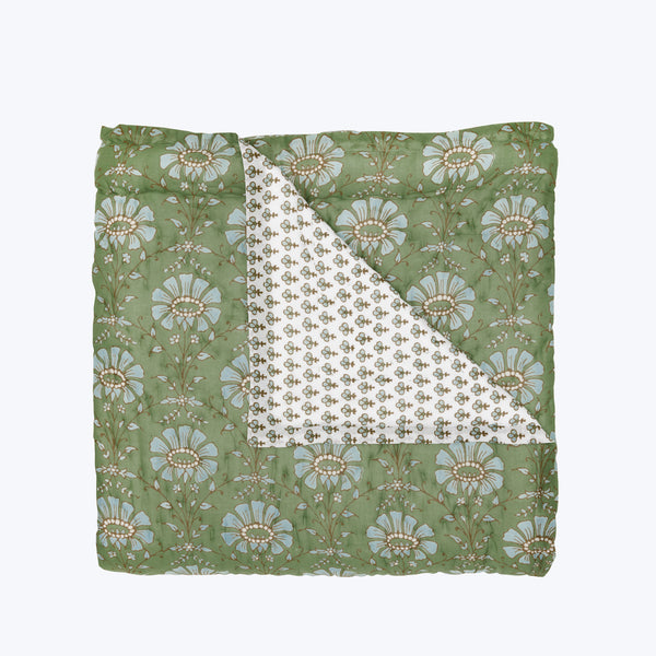 A soft sage green with delicate blue and white flowers inspired by a spring meadow . Quilted by hand, printed on pure cotton voile, soft and lightweight, yet so warm. Quilt is printed on both the front with a coordinating floral back.